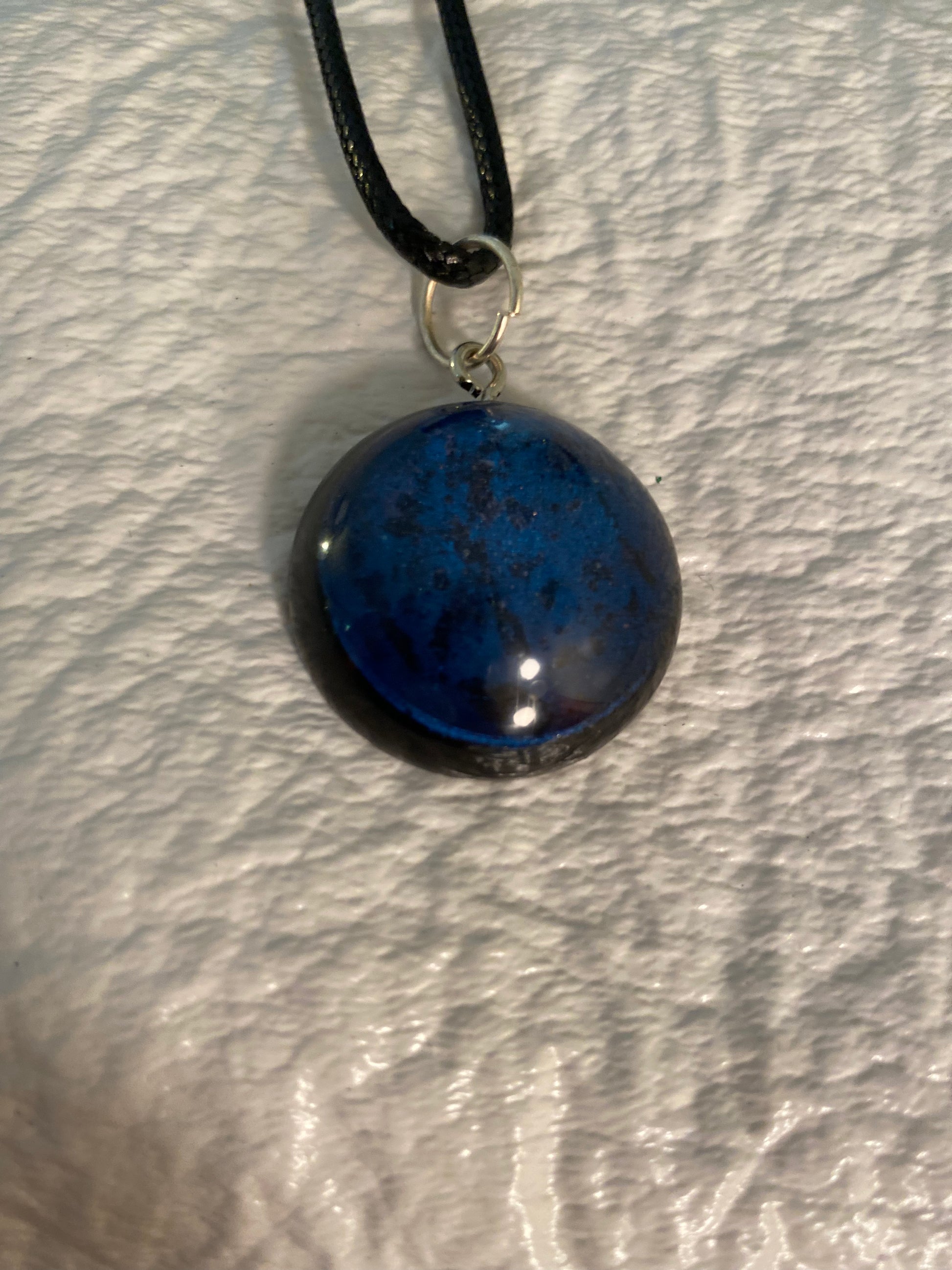 I used a mold for the shape and blue powder and hairspray with some glitter to give it this amazing look. It looks like the galaxy in blue. This charming black rope necklace comes with this piece.