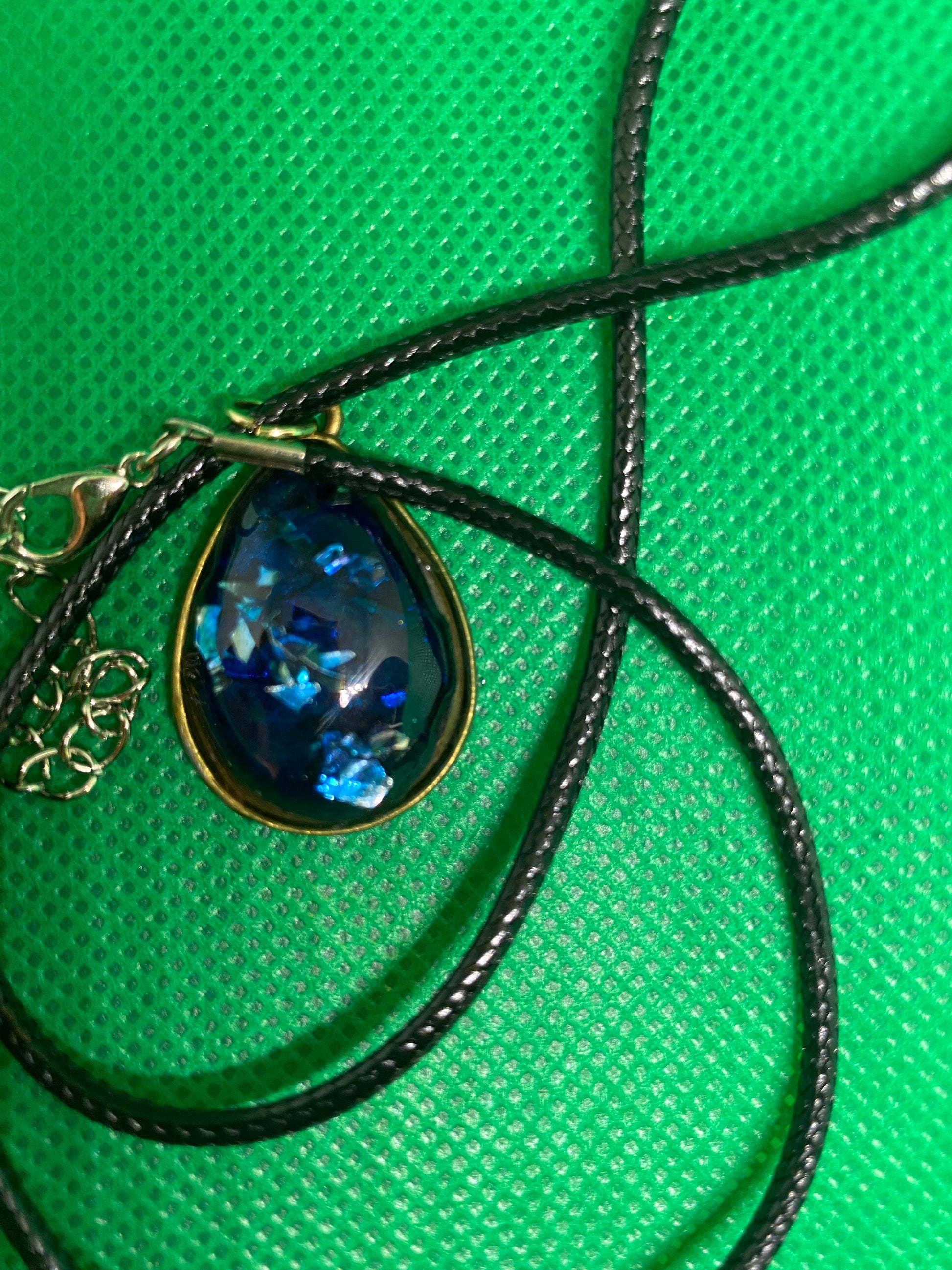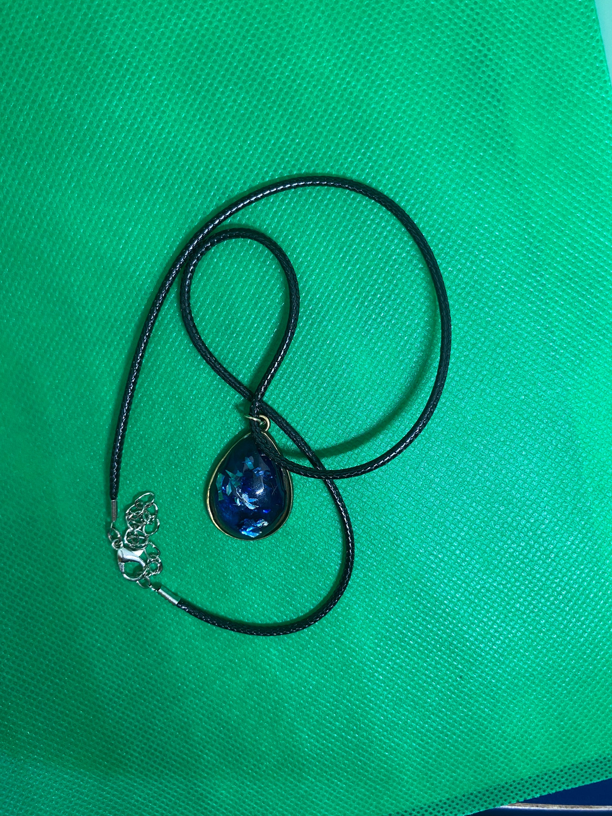 This beautiful teardrop necklace has clear resin with blue pigment color and blue and silver glitter flakes inside. It also comes with this nice black rope necklace